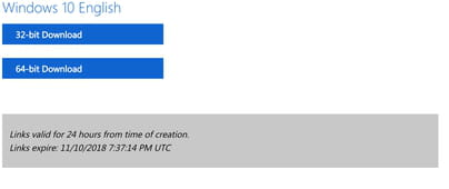 The page should, then, give you access to the downloads for the Windows 10 ISO image in 64-bit and 32-bit in English :